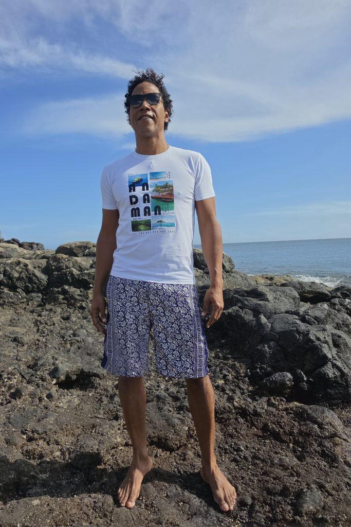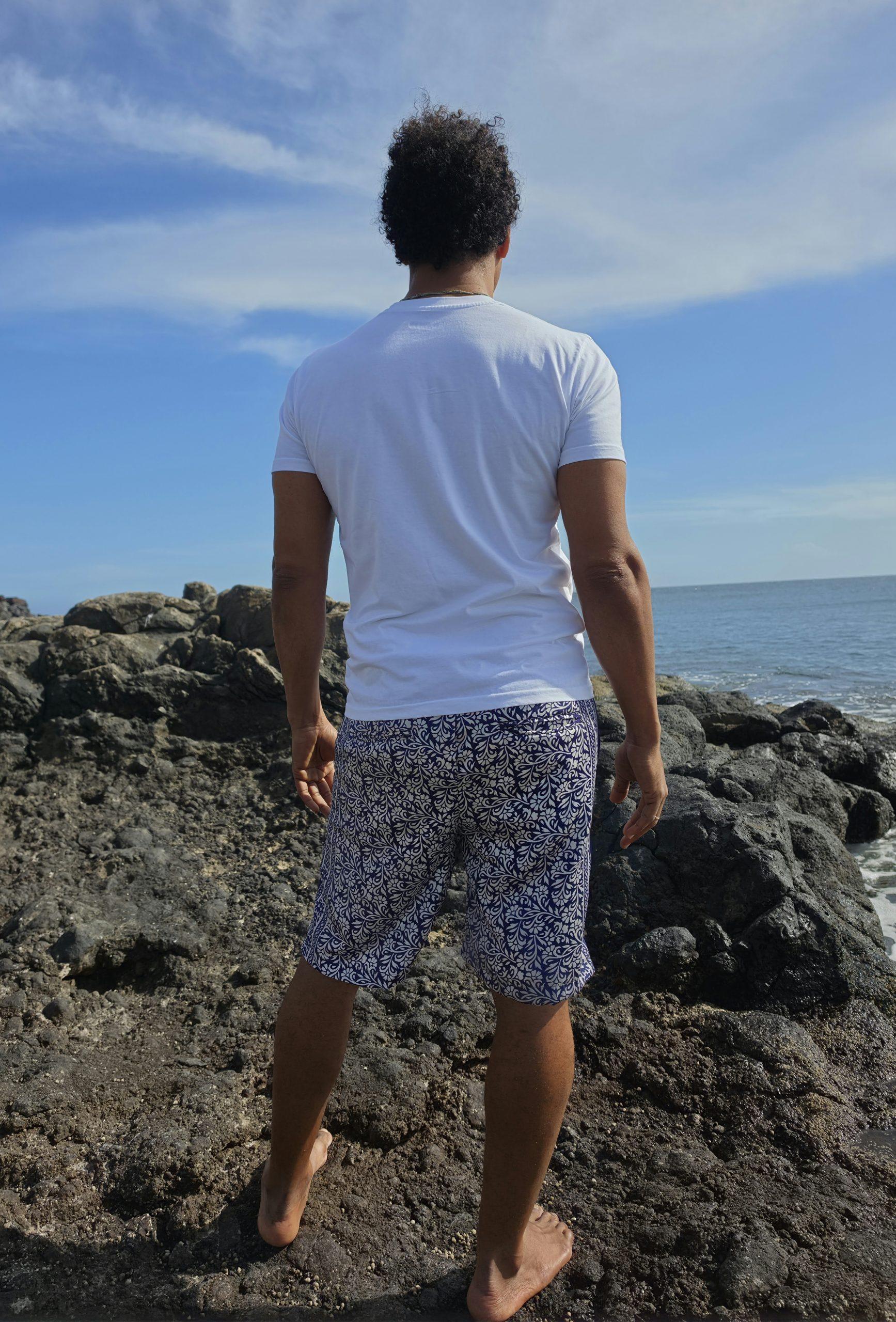 Bermuda de seda para vestir o para sport playa y montaña con bolsillos, cinturilla y cremallera, botones de coco natural. Estampado azul marino blanco. Talla-XL, 101 cm de cintura. Modelo exclusivo y piezas unicas. Comodo, ecologico y elegante.