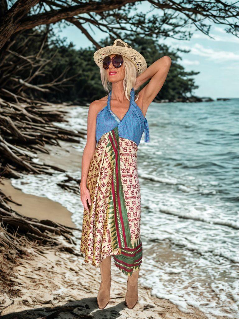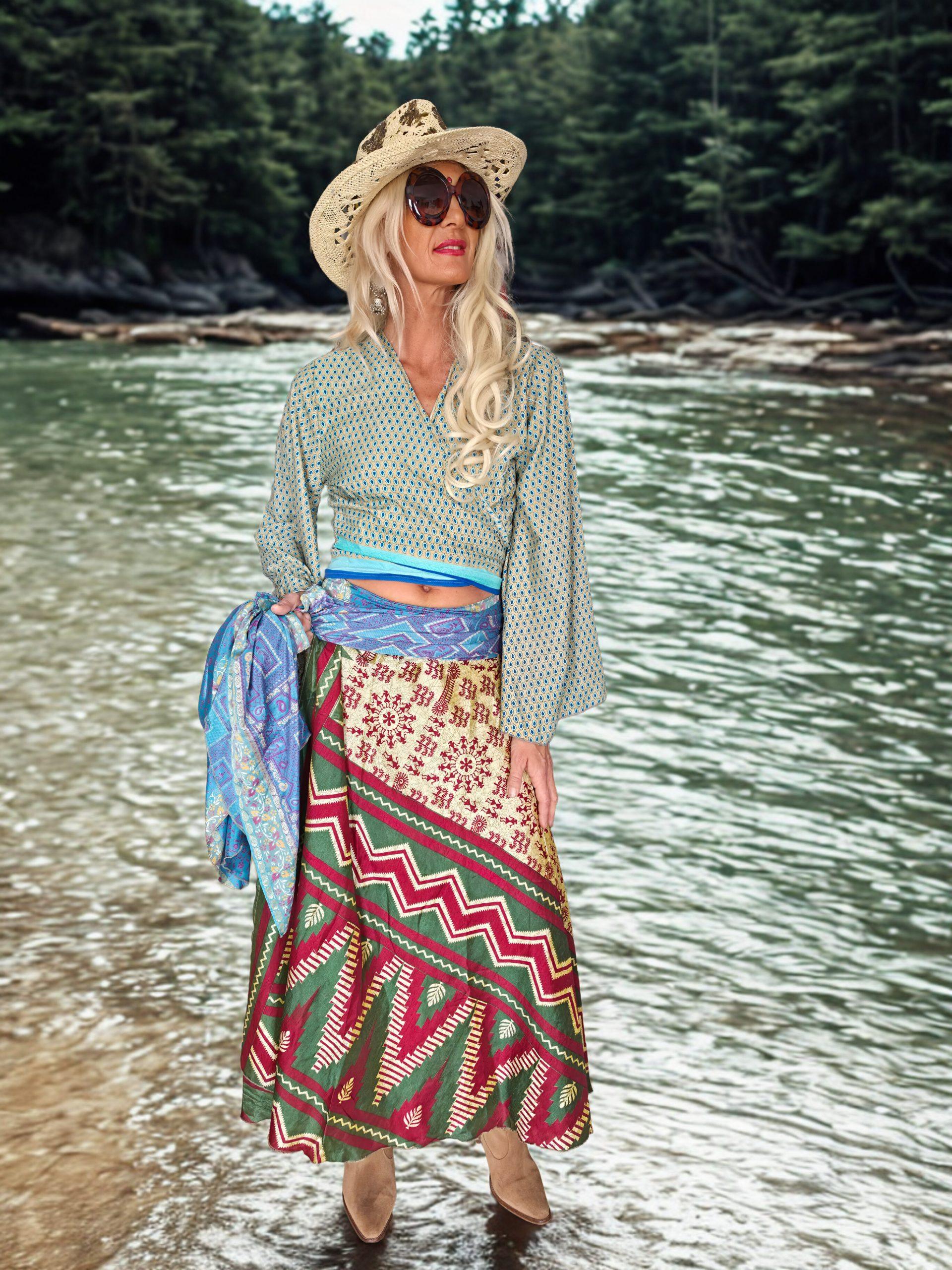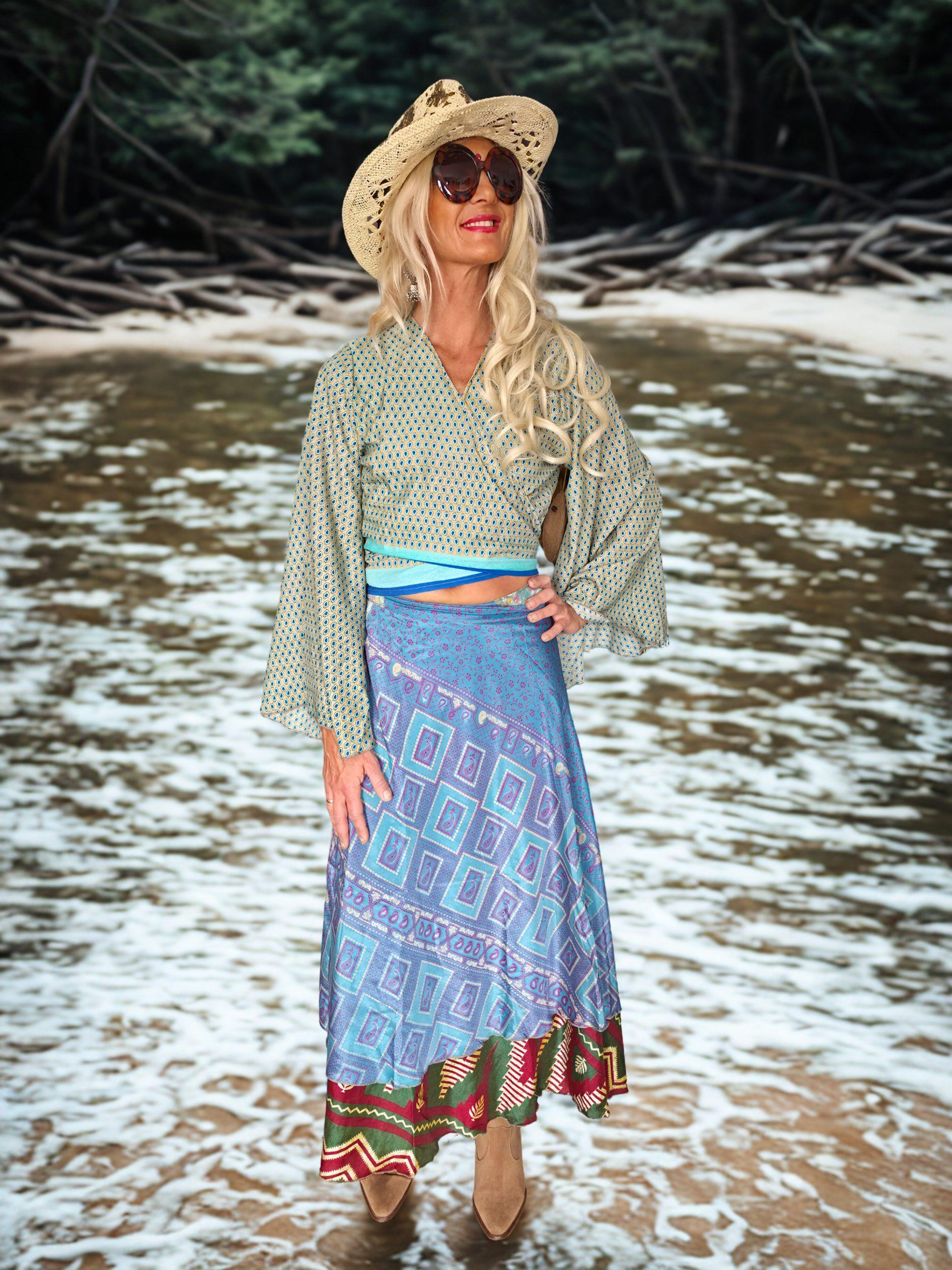 Falda de seda transformable y reversible multiposicion con dos telas diferentes. Estampado color azul lila. Se puede usar tambíen como vestido y top (ver tutoriales). Talla unica.