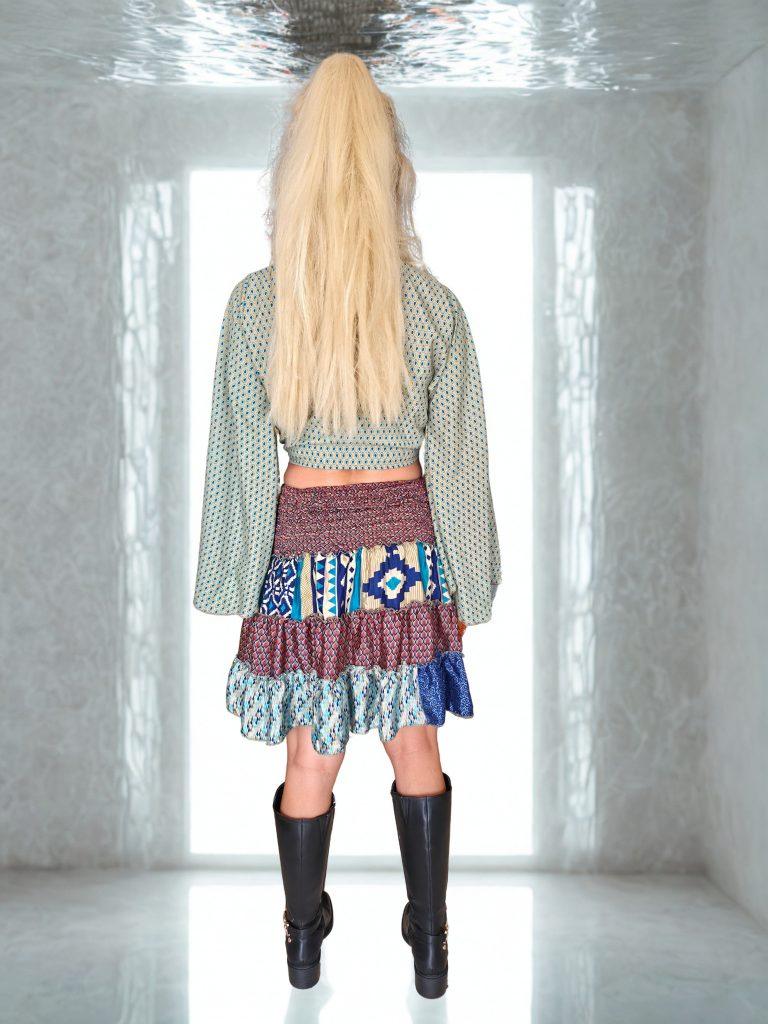 Falda de seda corta con elastico en la cintura, talla unica. Estampados combinados tipo patchwork. Colores marron, azul multicolor. Tejido ecológico y natural. Se puede usar de top y vestido corto.