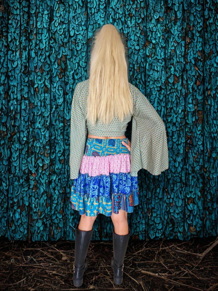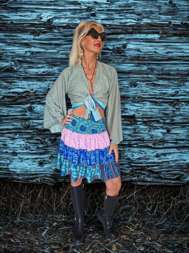 Falda de seda corta con elastico en la cintura, talla unica. Estampados combinados tipo patchwork. Colores rosa y azul. Tejido ecológico y natural. Se puede usar de top y vestido corto.