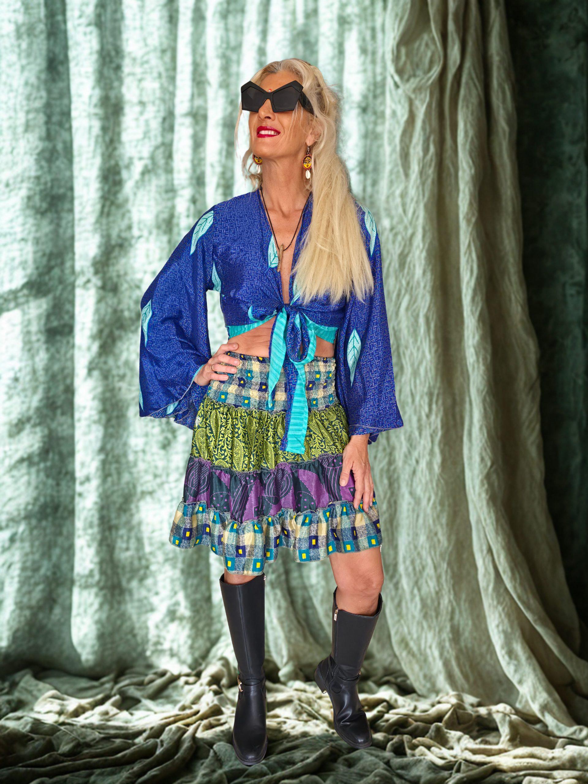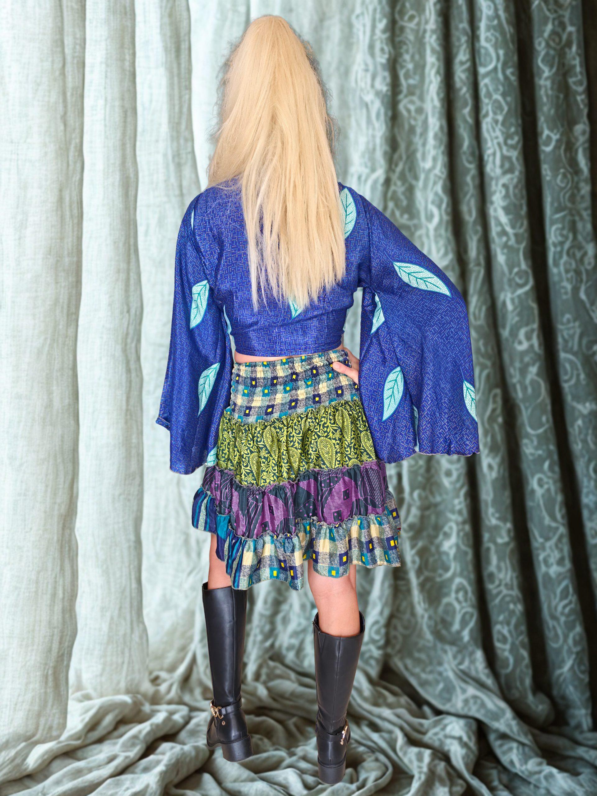 ​ Falda de seda corta con elastico en la cintura, talla unica. Estampados combinados tipo patchwork. Colores verde, lila multicolor. Tejido ecologico y natural. Se puede usar de top y vestido corto.