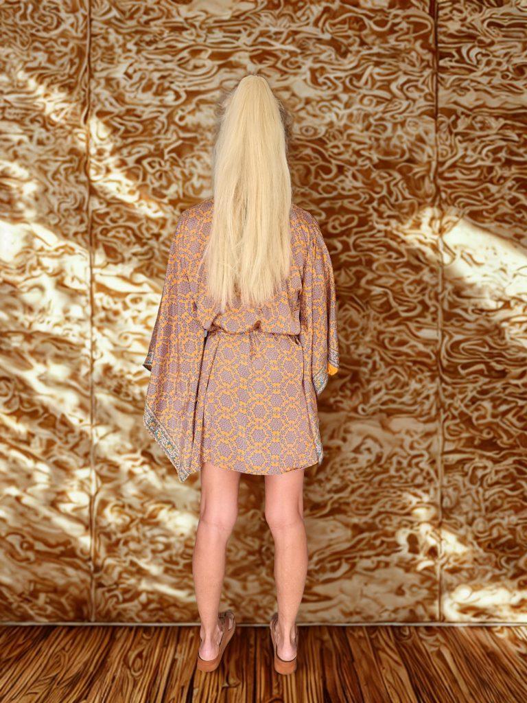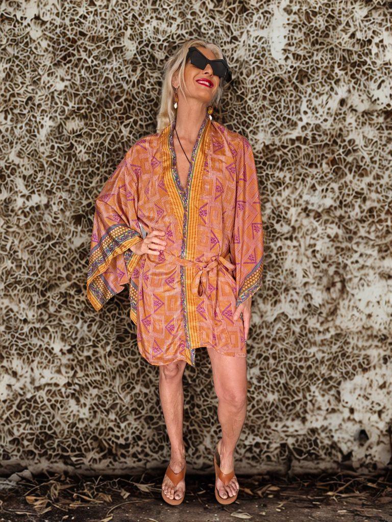 Kimono corto de seda con mangas tipo japones y cinturon. Estampado naranja, amarillo y rosa. Talla unica. Modelo exclusivo. Colores unicos. Tejido ecologico y transpirable.
