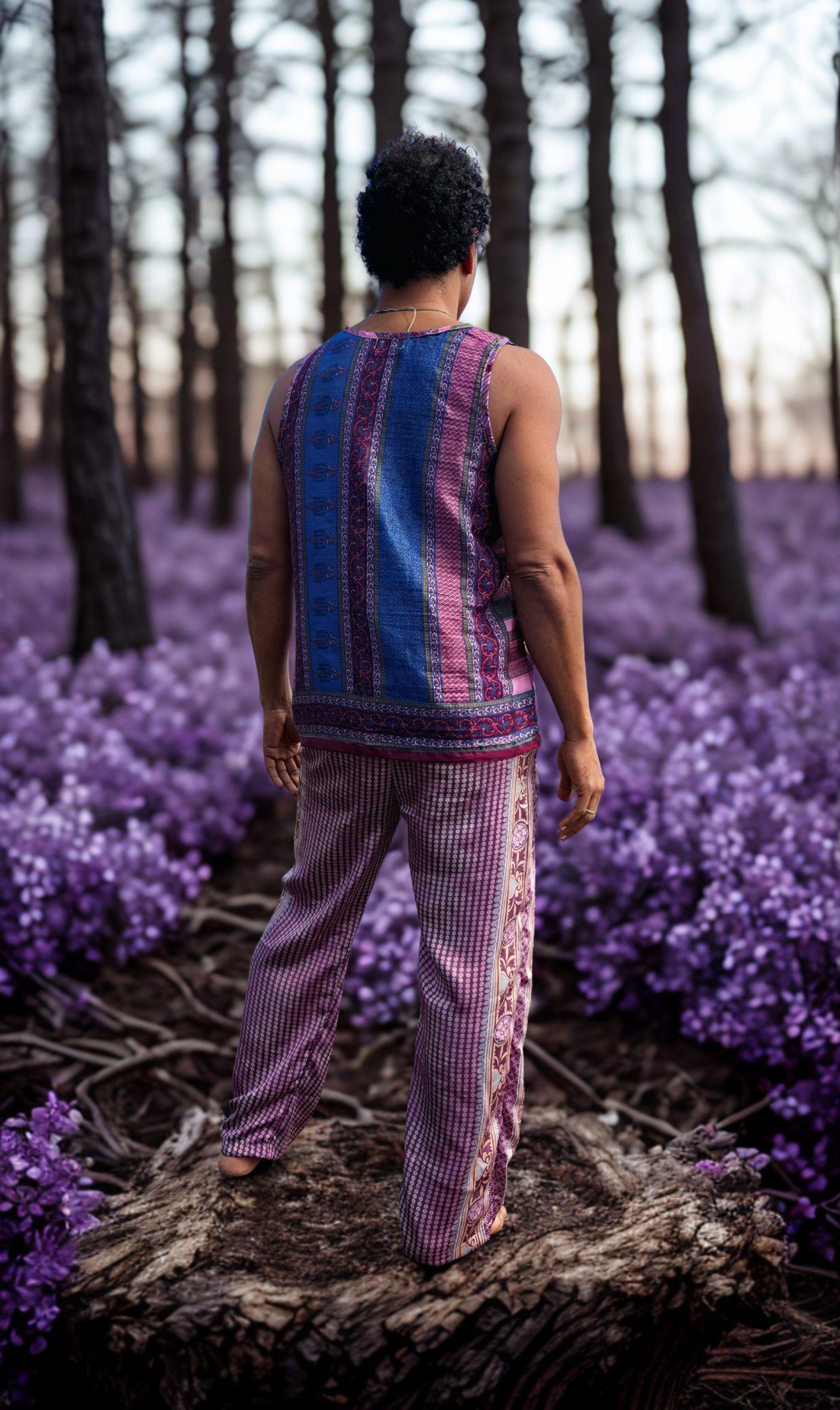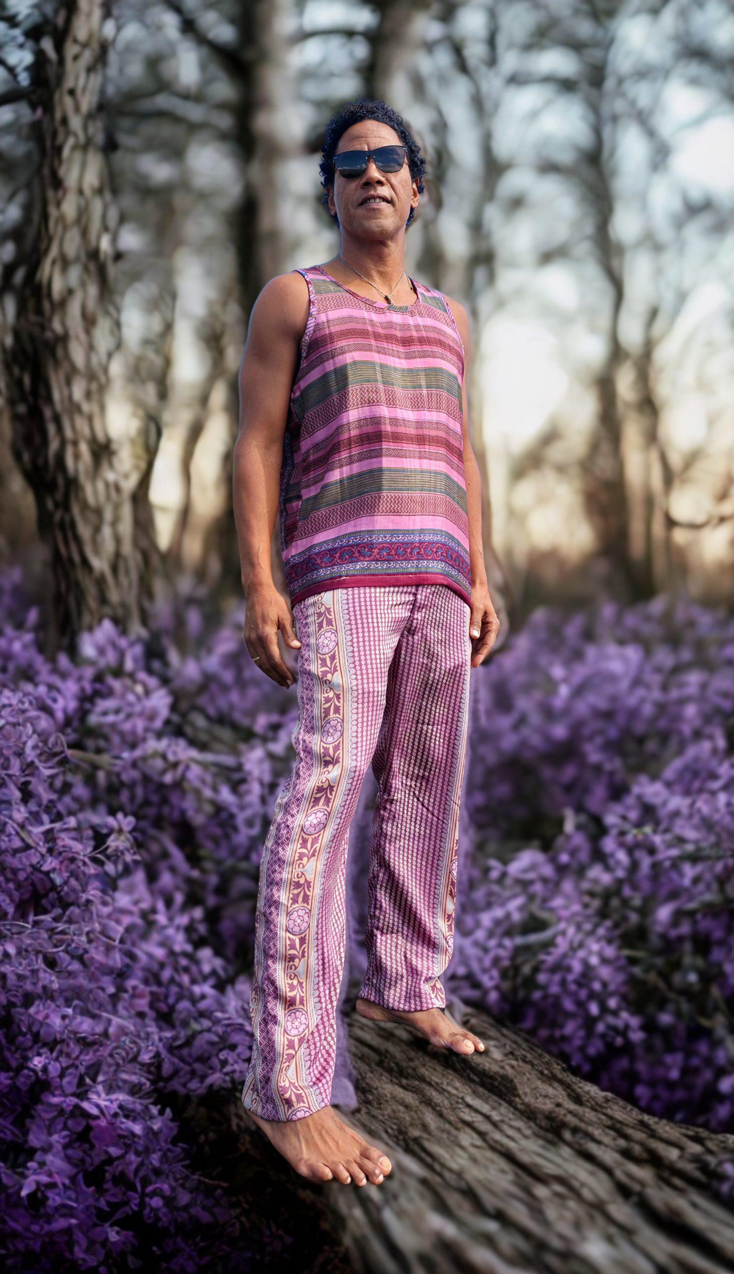 Pantalón largo de seda y viscosa de vestir con cremallera, citurilla y trabillas para poner cinturon, bolsillos y corte recto. Estampado lila multicolor. Boton de coco. Talla XL 101cm cintura/ 107 largo.