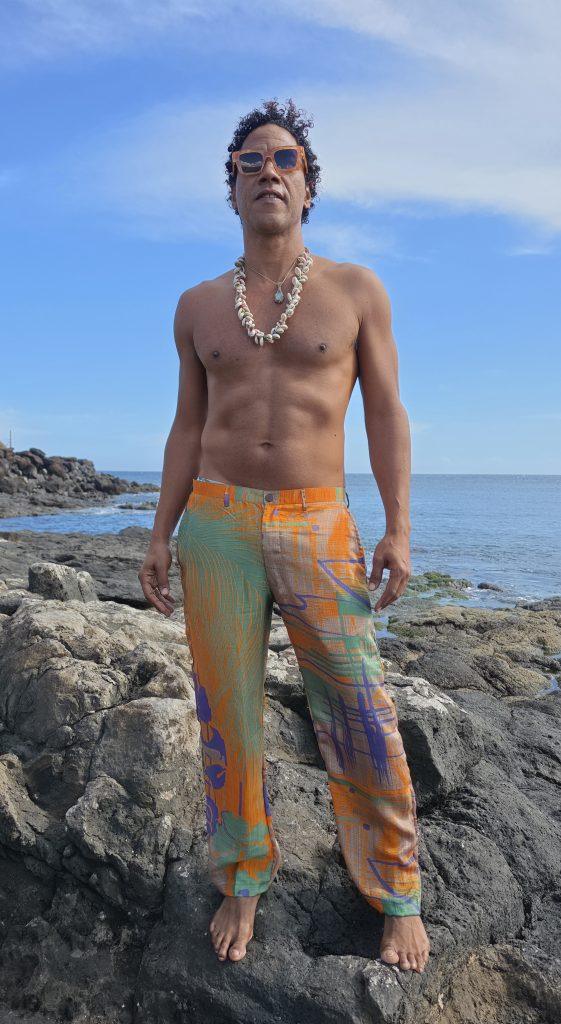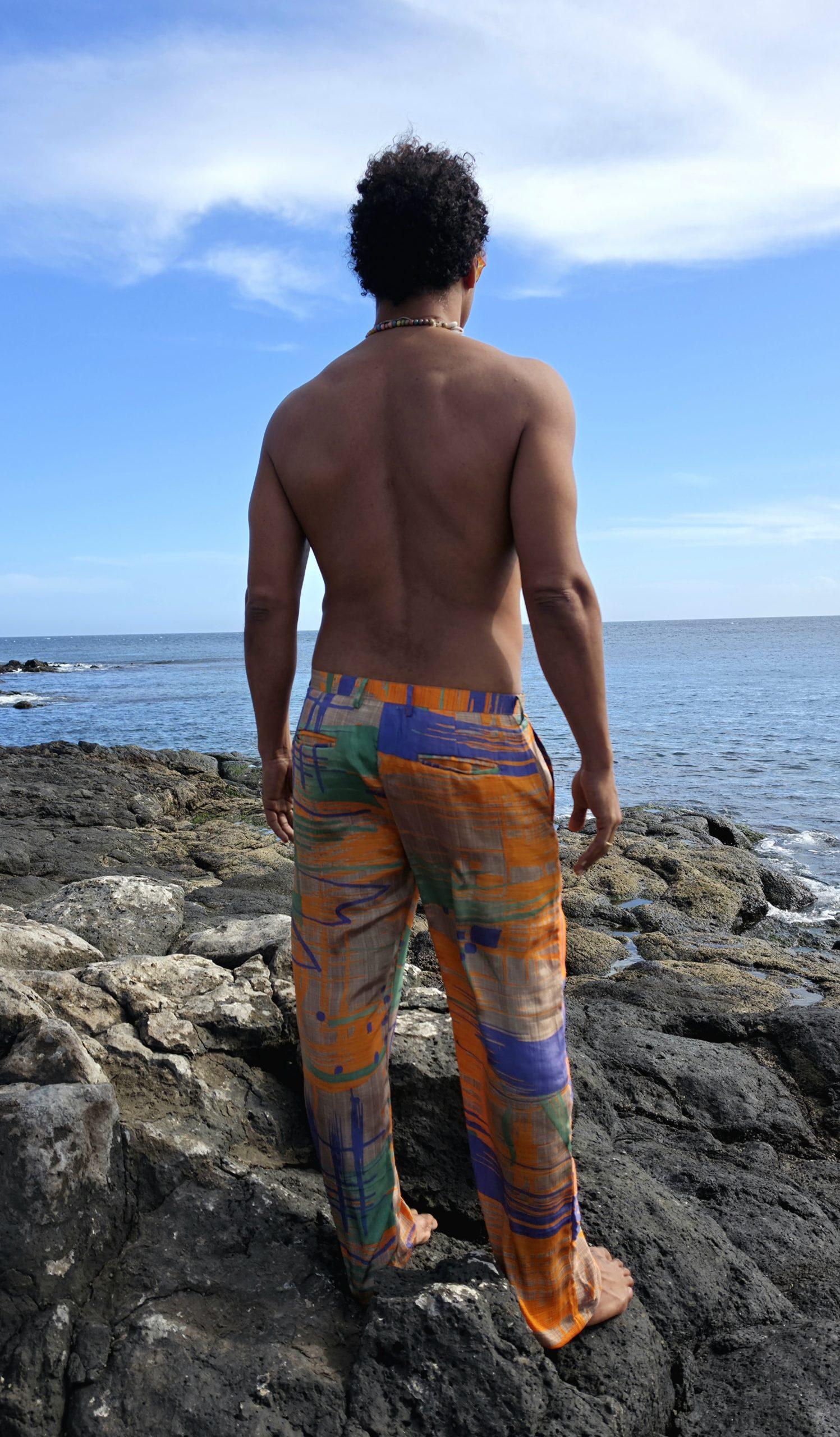 Pantalón largo de seda y viscosa de vestir con cremallera, citurilla y trabillas para poner cinturon, bolsillos y corte recto. Estampado naranja, verde y azul. Boton de coco. Talla XL 101cm cintura/ 107 largo.