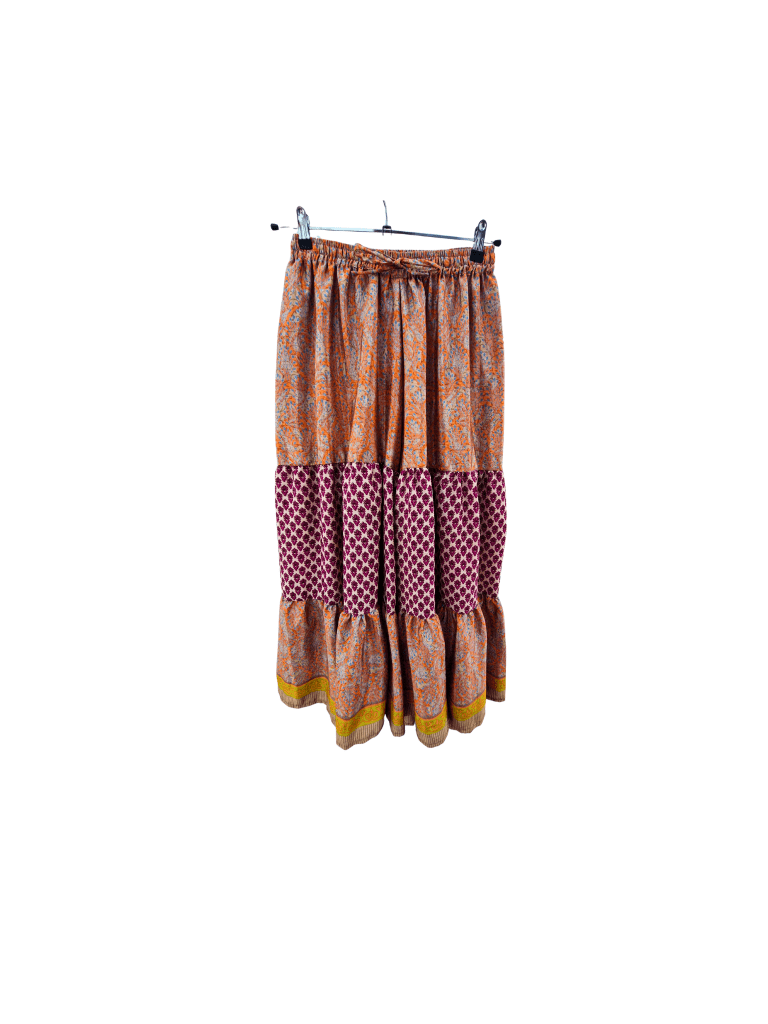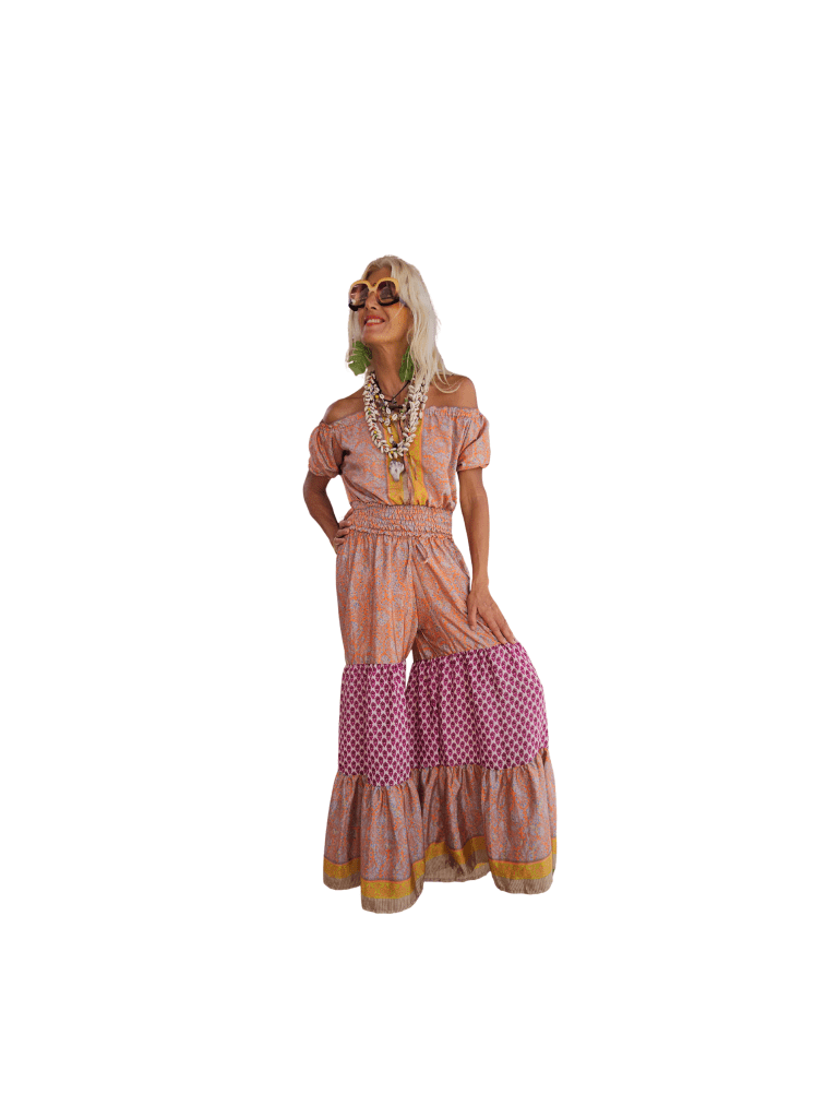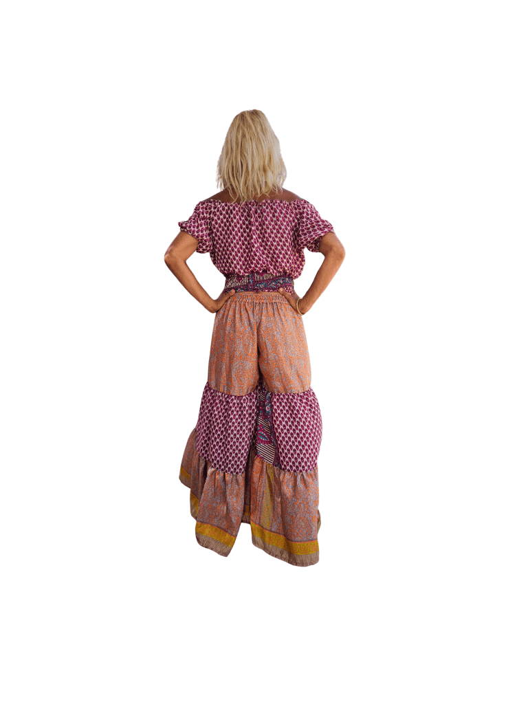 Pantalón de seda modelo samba bicolor. Pierna acampanada, elástico en la cintura, con tres volantes. Estampado naranja y rosa, con detalles en amarillo. Talla única.
