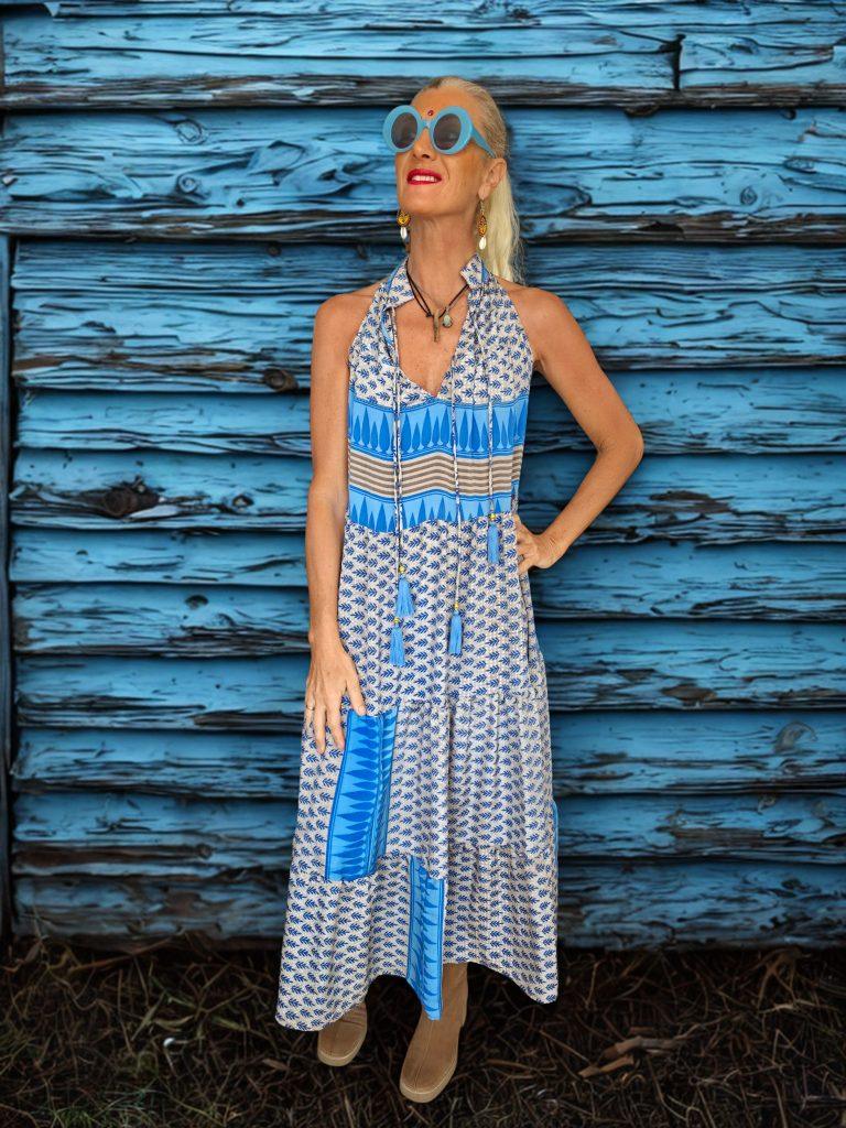 Vestido baiana azul y beige