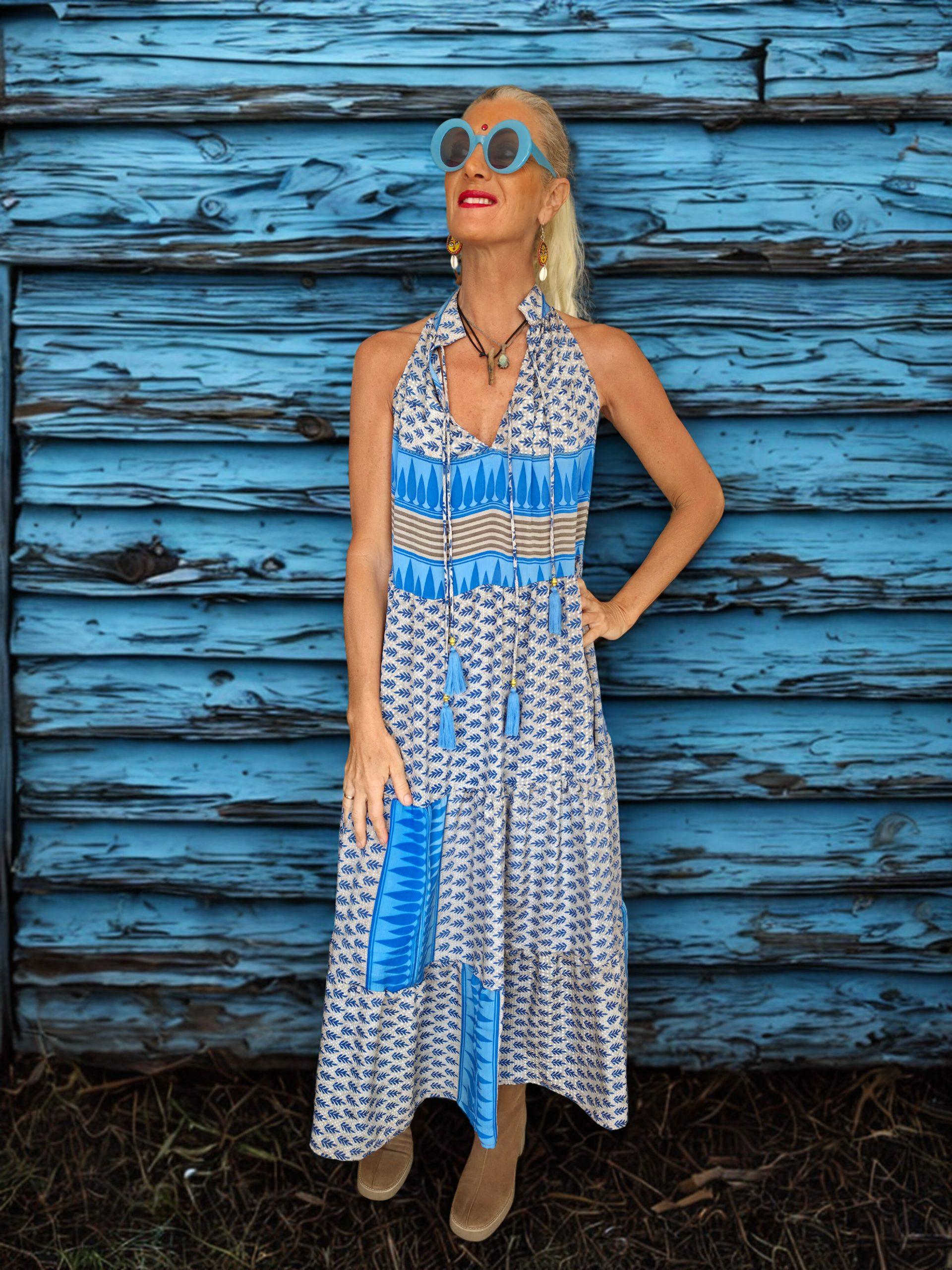 Vestido de seda largo suelto y vaporoso con dos volantes en la falda y cuello camisero tipo halter. Estampado colores azul y beige. Talla unica y colores variados, fresco y muy comodo.
