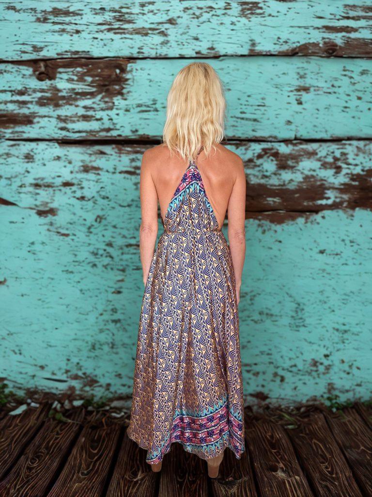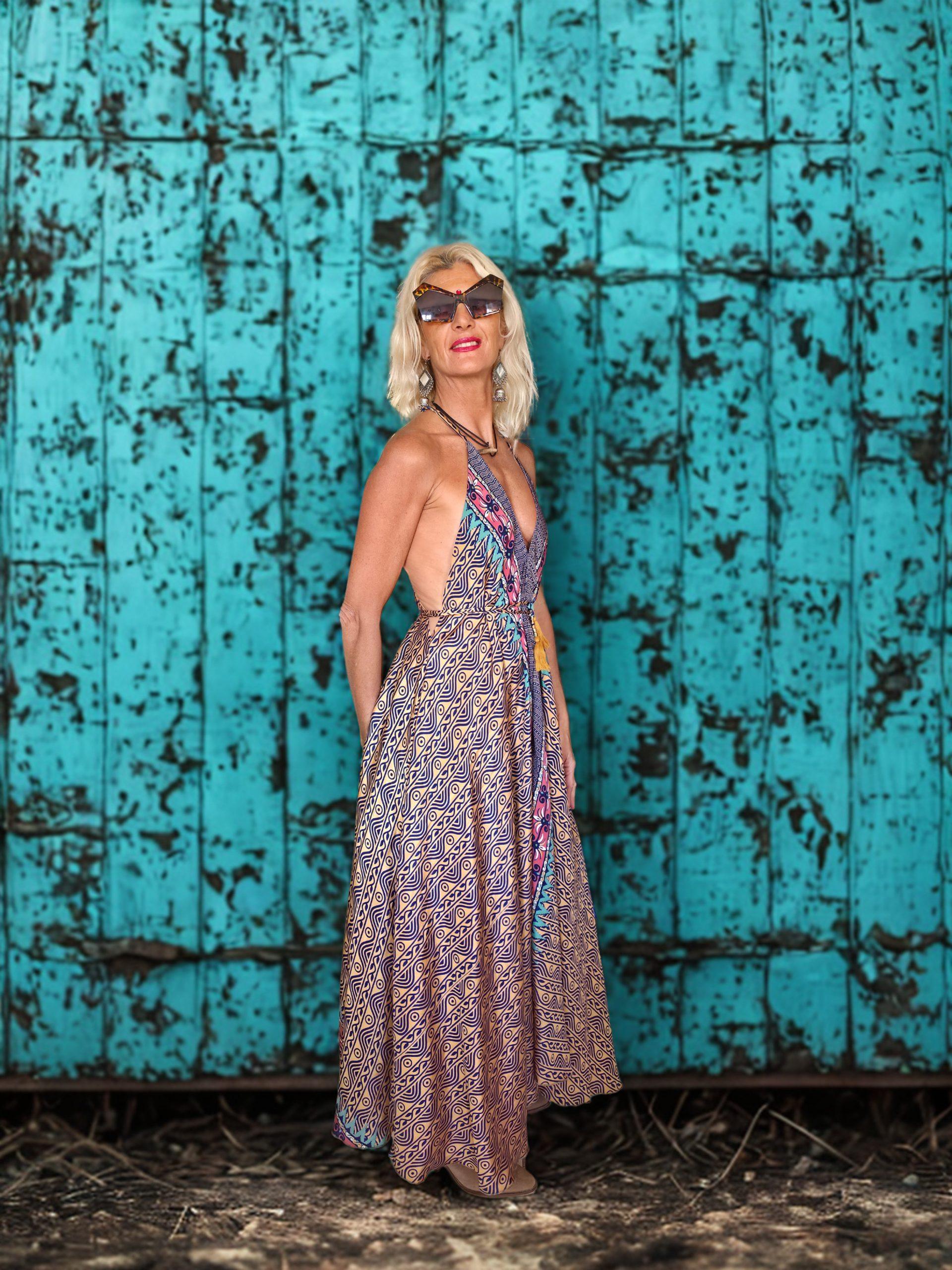 Vestido largo de seda y viscosa con tirantes largos ajustables, vestido multiposicion. Estampado color beige azul coral. Talla unica. Pieza unica. Vestido comodo y traspirable, ecodress.