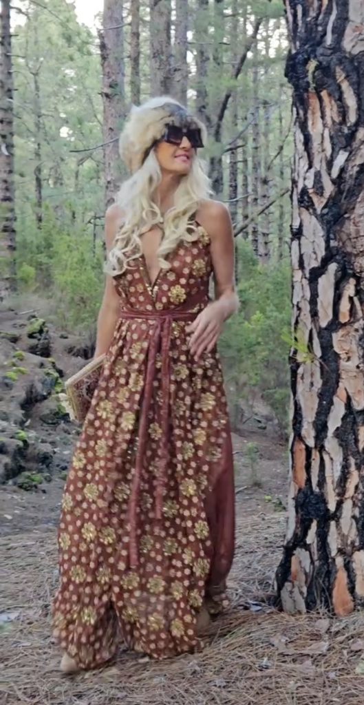 Vestido modelo boho joya color ocre con detalles florales bordados en abalorios y lentejuelas en color amarillo. Talla única.