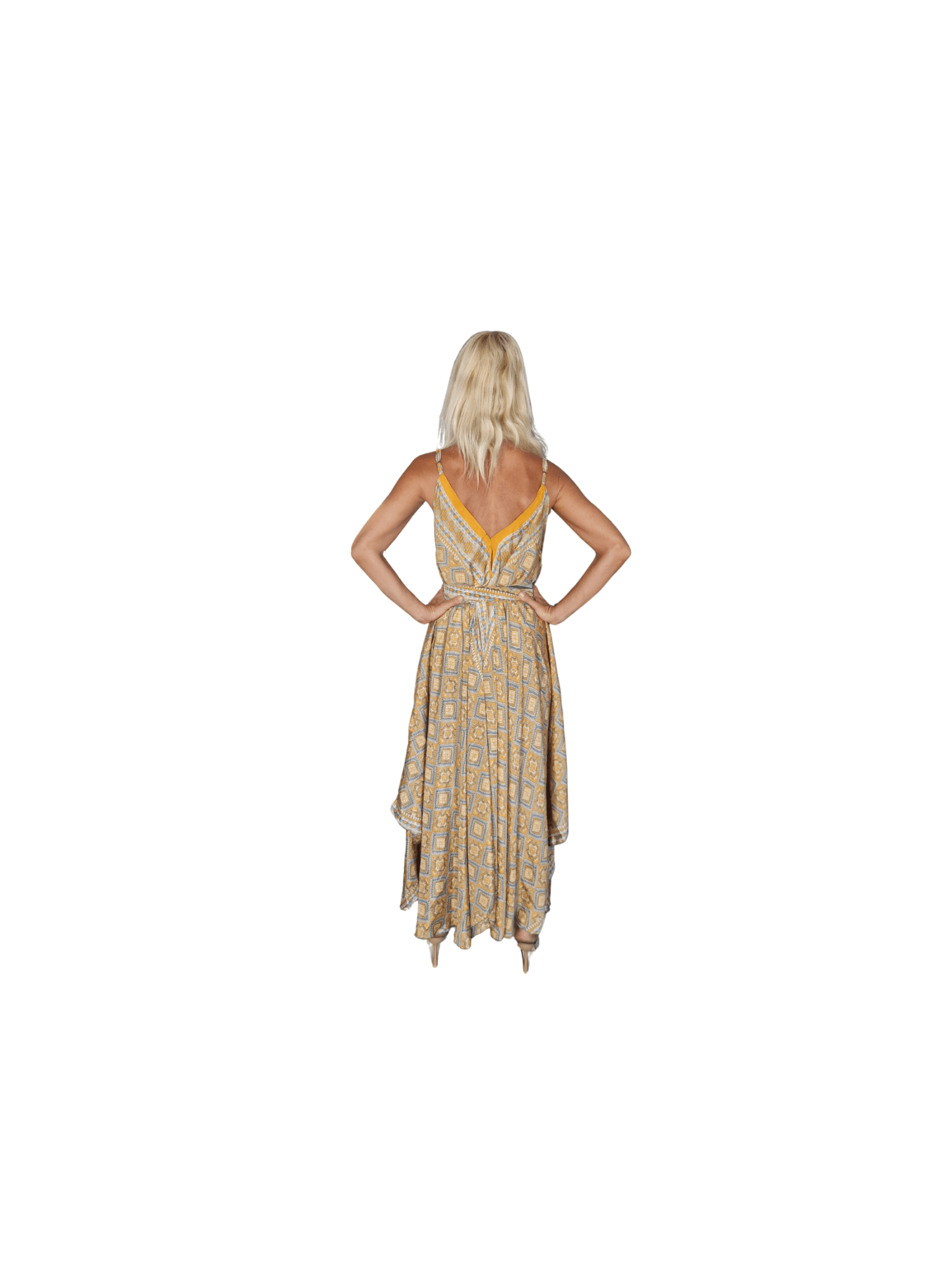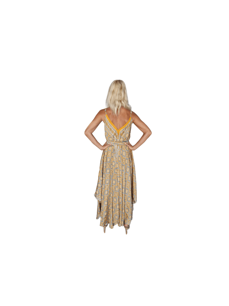 Vestido de seda largo modelo hang loose color amarillo, blanco, beige y detalles plata. Suelto con tirantes ajustables y cinturon del mismo tejido. Talla única.