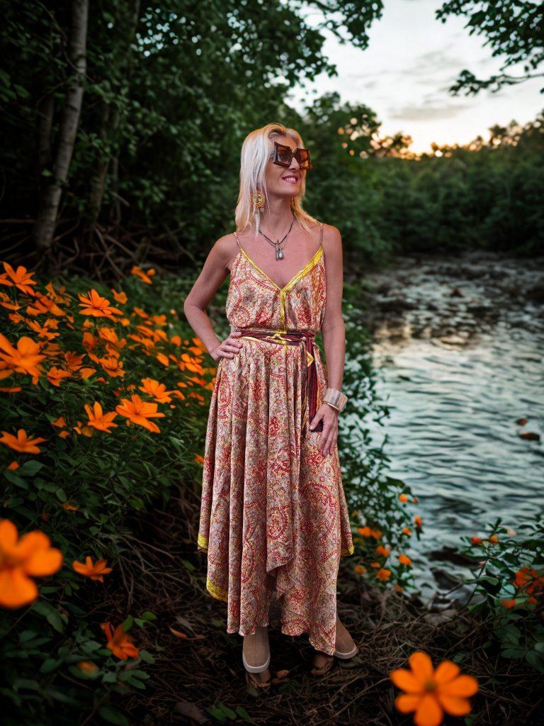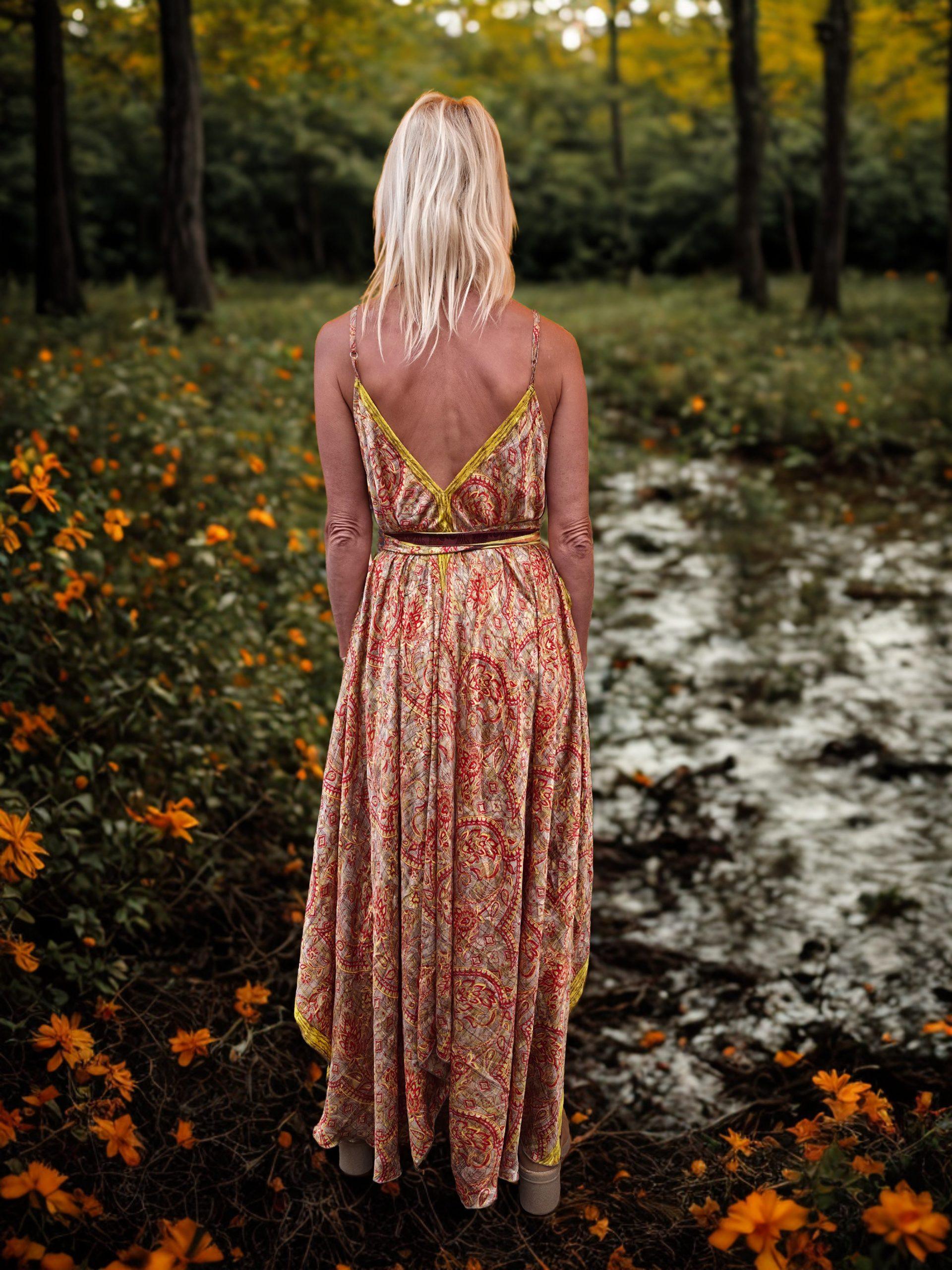 Vestido de seda y viscosa largo terminado en picos en la parte inferior. Tirantes ajustables, vestido suelto que viene con un cinturon en la misma tela para adaptarlo a la cintura o debajo del pecho. Estampado beige, rojo y amarillo. Talla unica.
