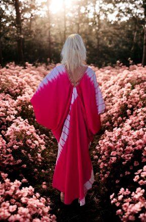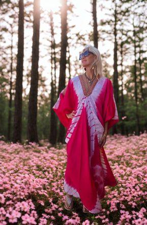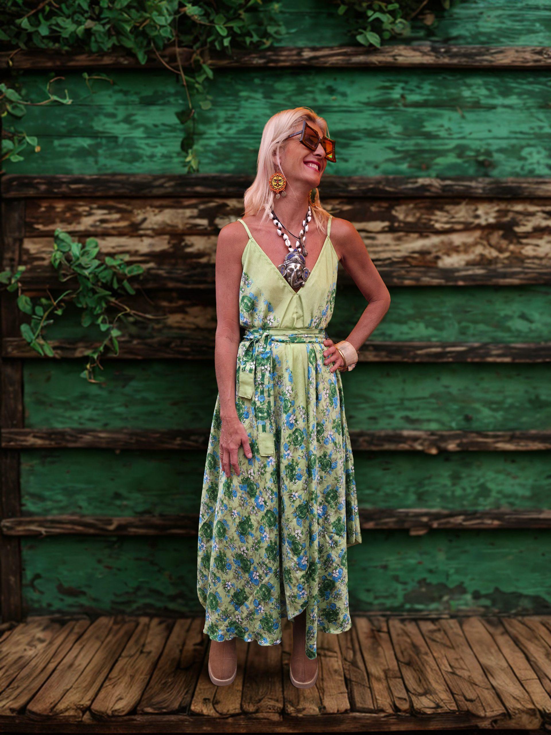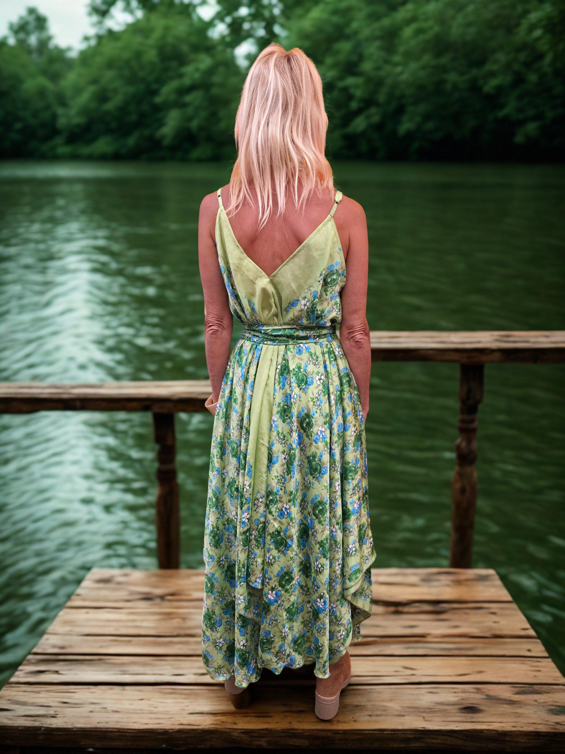 Vestido de seda y viscosa largo terminado en picos en la parte inferior. Tirantes ajustables, vestido suelto que viene con un cinturon en la misma tela para adaptarlo a la cintura o debajo del pecho. Estampado verde, azul y blanco. Talla unica.