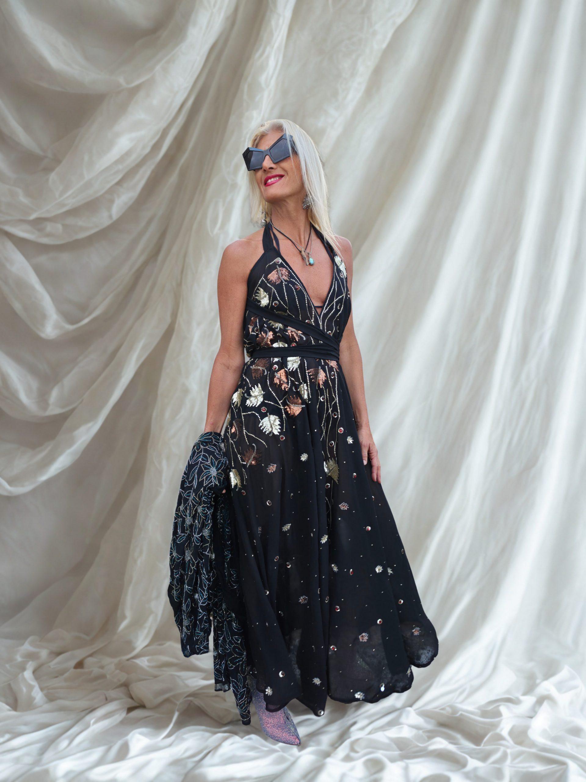Vestido en shifon en color negro con detalles en habalorios y pedrerias en color cobre y plata. Talla única.
