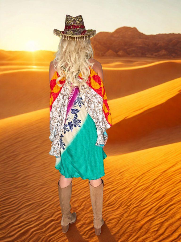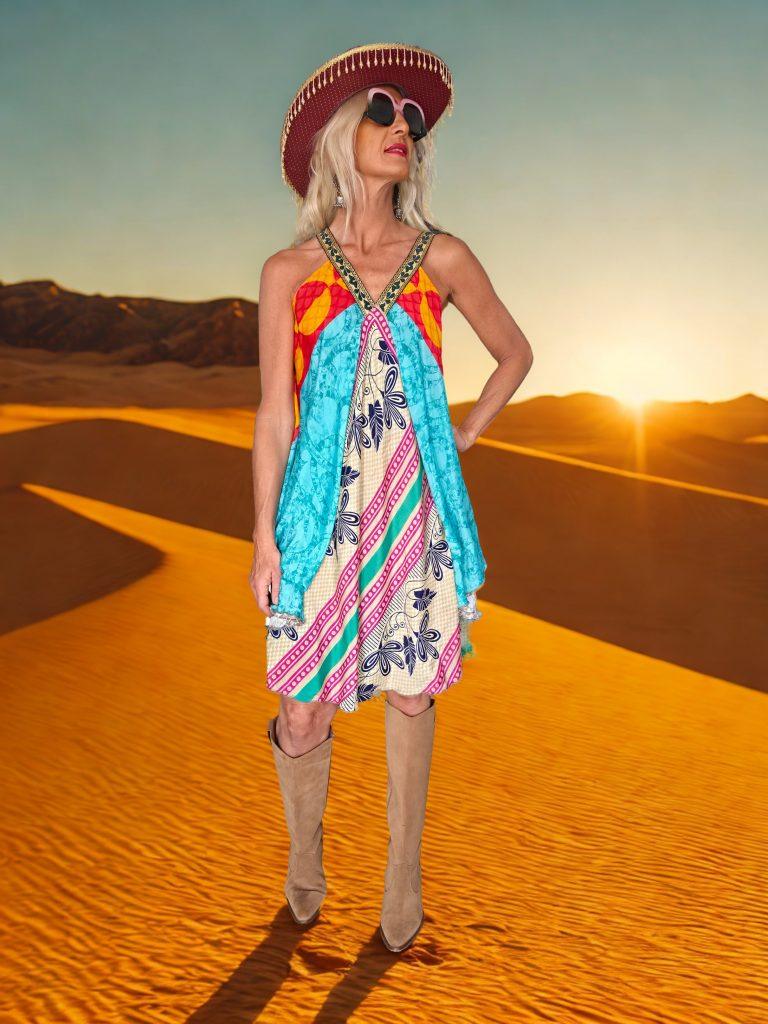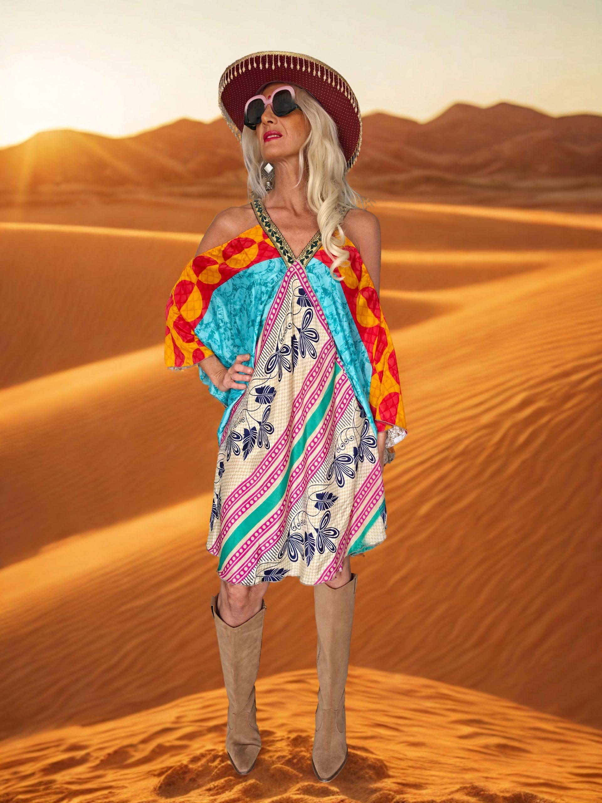 Vestido largo de seda y viscosa combinando dos telas diferentes. En estampado azul, rosa, beige, multicolor con abertura en los hombros,tirantes bordados, talla unica. Este vestido se puede usar con o sin mangas. Pieza unica.